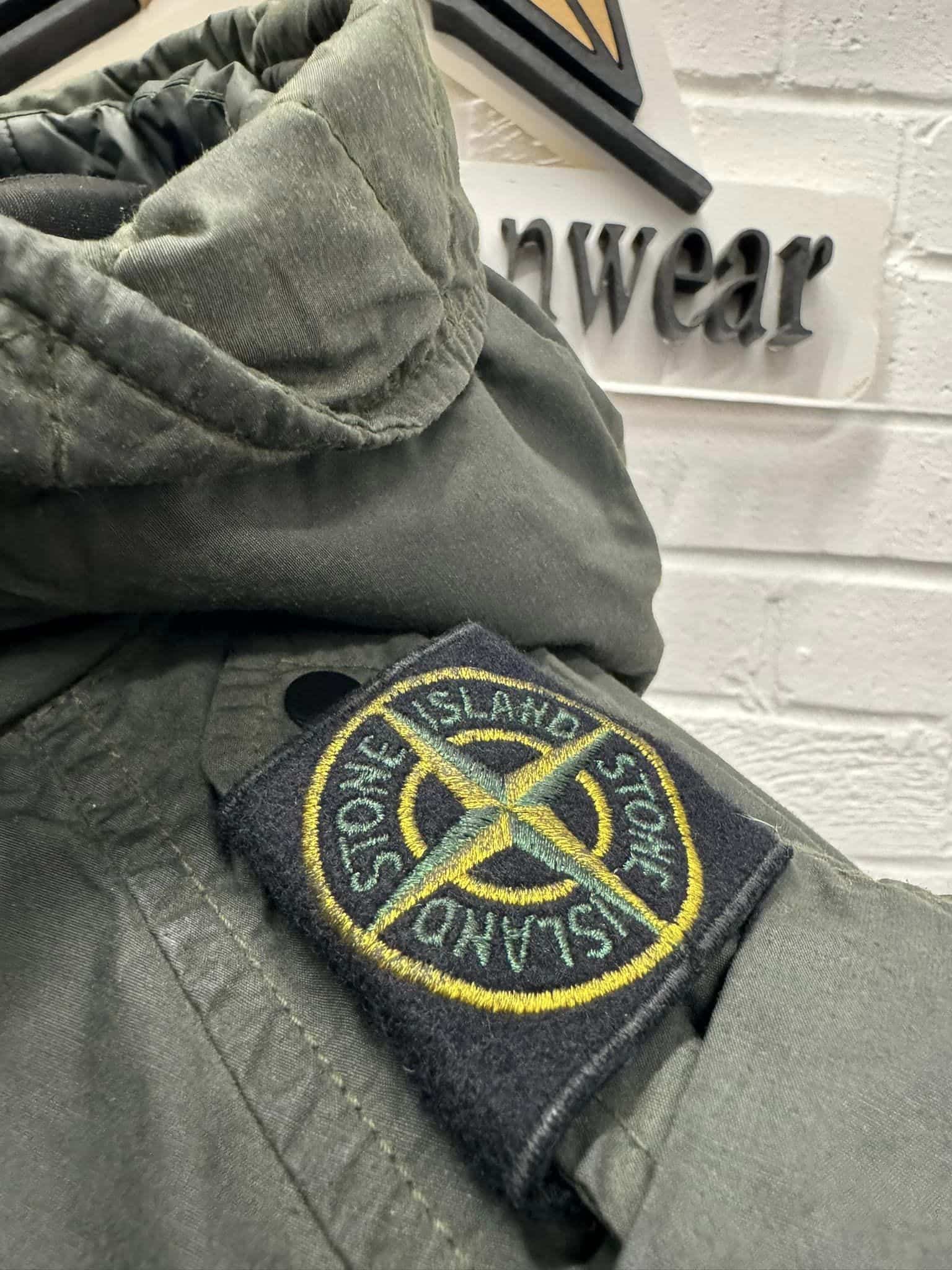 The removable sleeves are made from a stretch wool knit fabric, featuring a combination of stitching techniques. The sleeves are held to the body by a hidden zipper. Hood with overstitched padded band and parallel vertical drawstrings on the back, with the pull hidden by herringbone tape. Epaulettes, the left one embellished with the Stone island Compass badge. Slanting hand pockets with hidden zipper fastenings. Two-way zipper fastening, edged with nylon tapes.