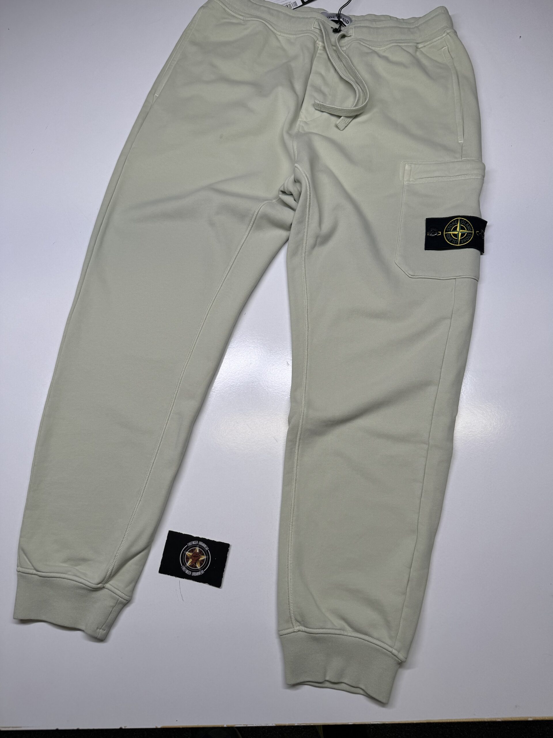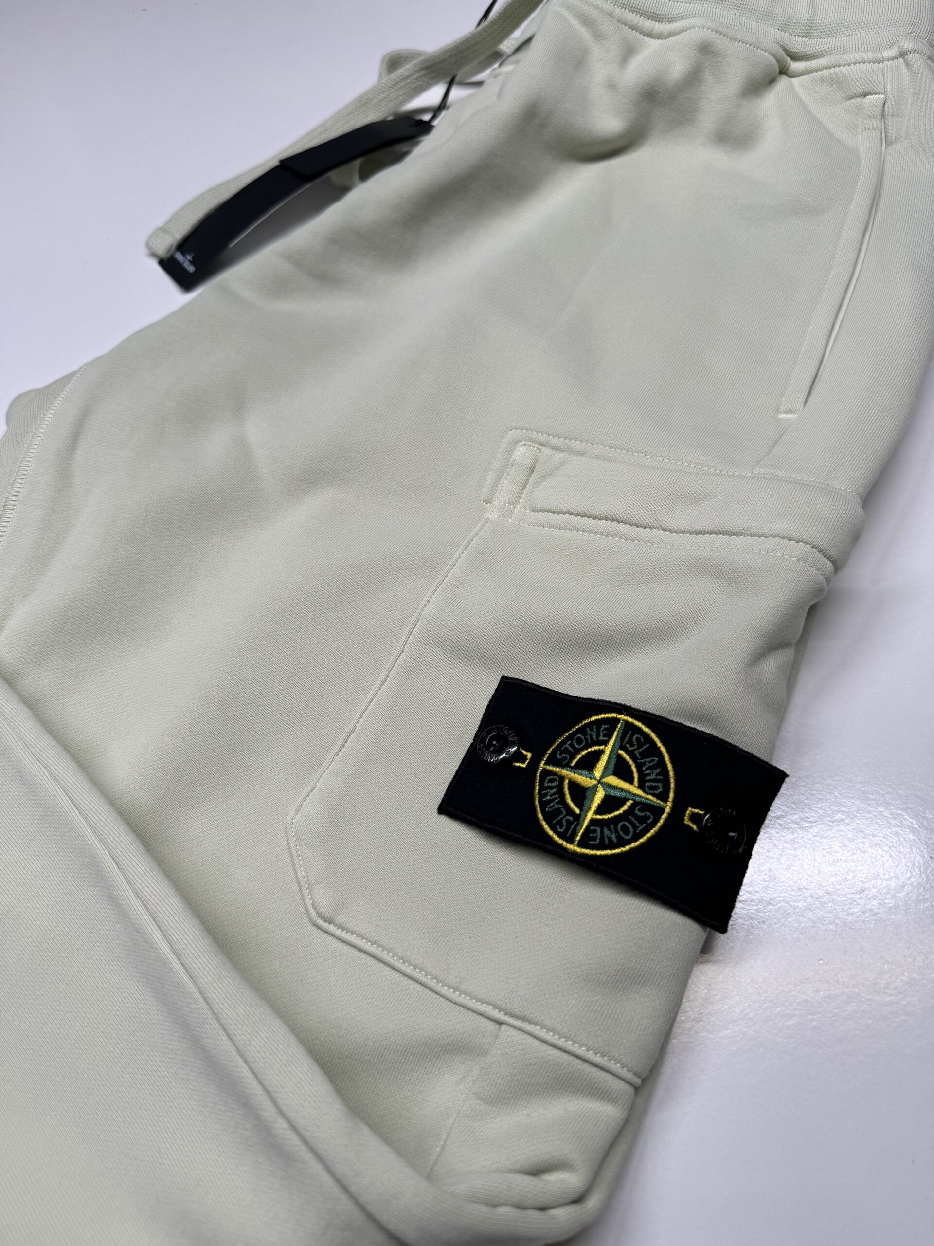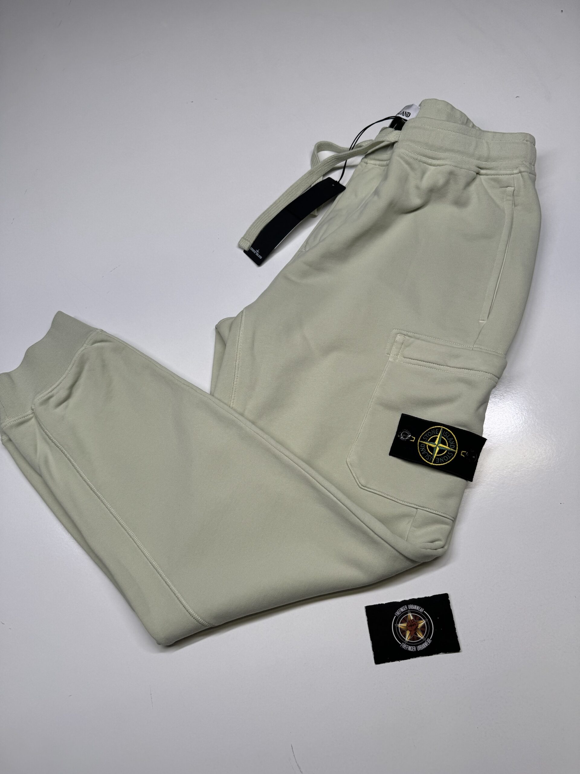 Regular fit. Hand pockets on seam. One back pocket with hidden snap fastening. Patch pocket on the left leg, featuring the Stone Island badge; hidden zip fastening. Elasticated waist with outer drawstring. Ribbed leg bottoms. Zip fly.