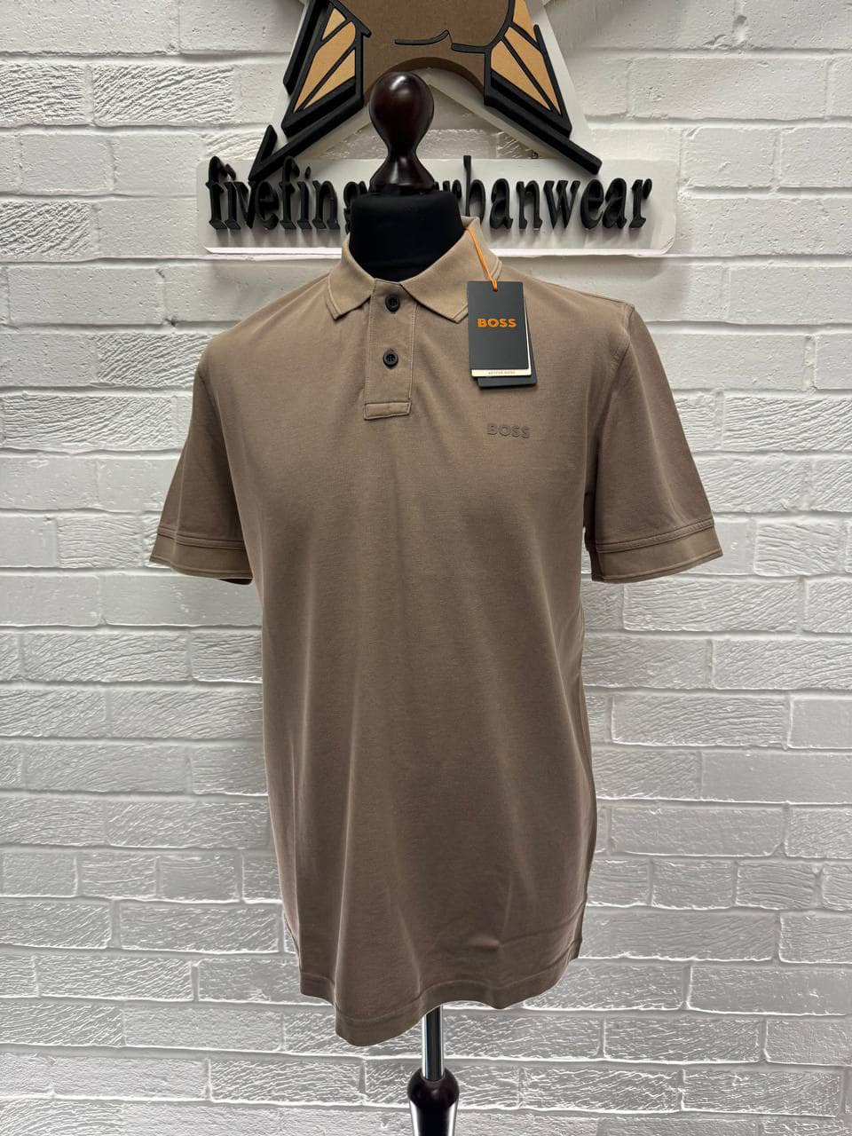 BOSS Prime Polo T Shirt In Brown , Slim Fit. A branded two button fastening at the neck in grey with a ribbed polo collar and ribbed cuffs on the short sleeves. The signature BOSS logo is situated on the left of the chest in a raised rubberised print in brown