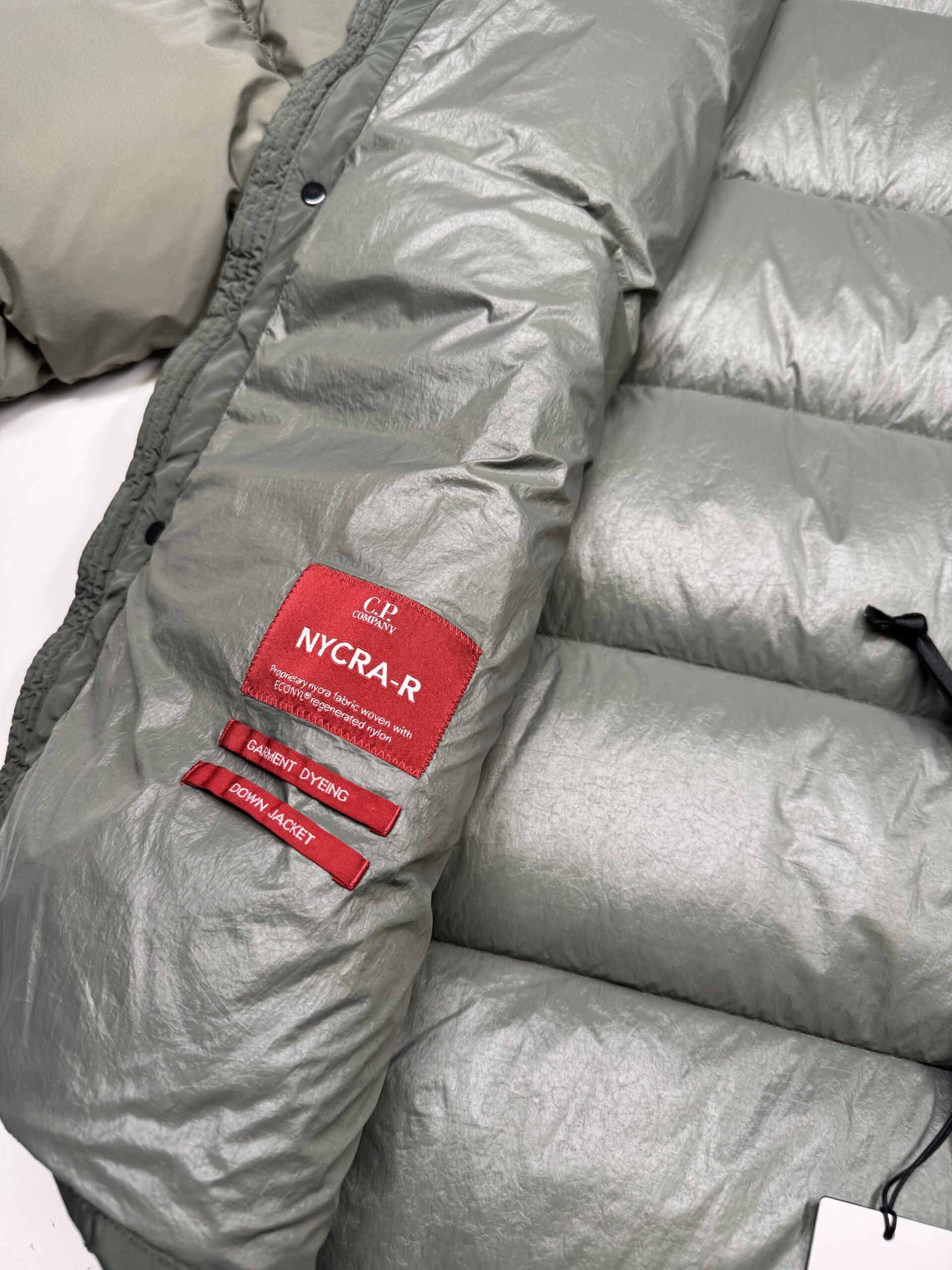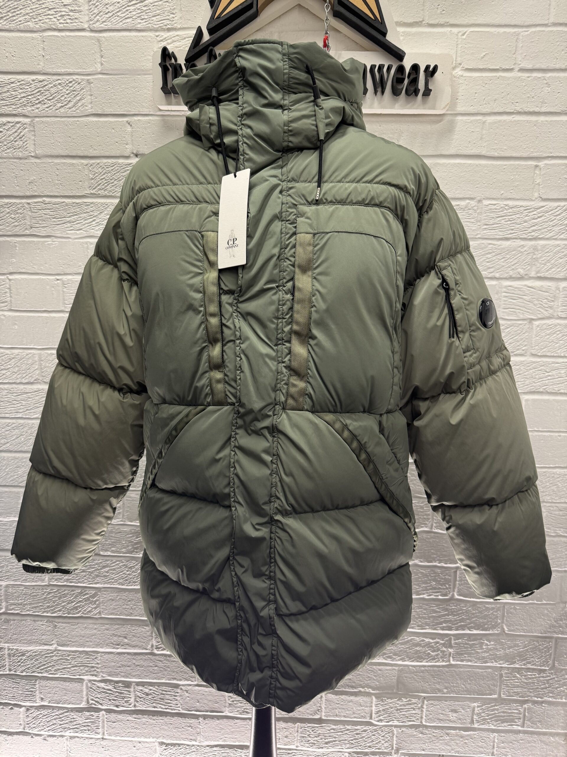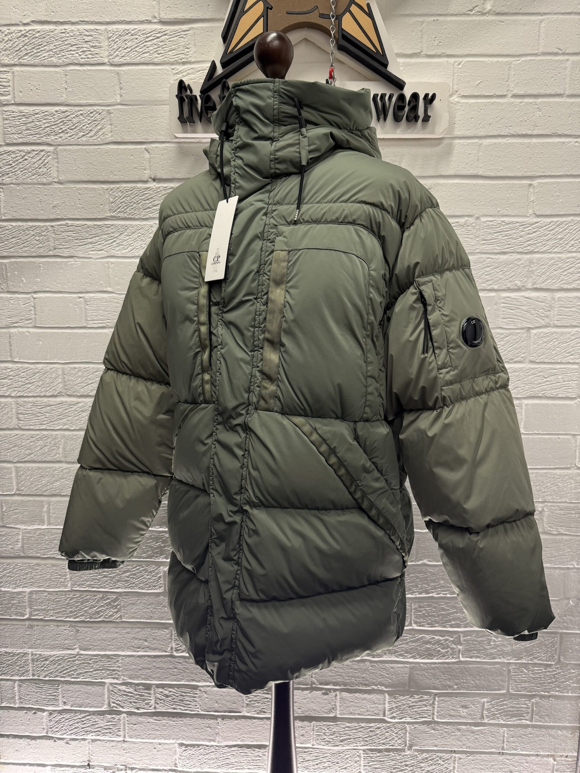 C.P. COMPANY GARMENT DYED ‘NYCRA-R”DOWN LENS HOODED JACKET IN GREEN