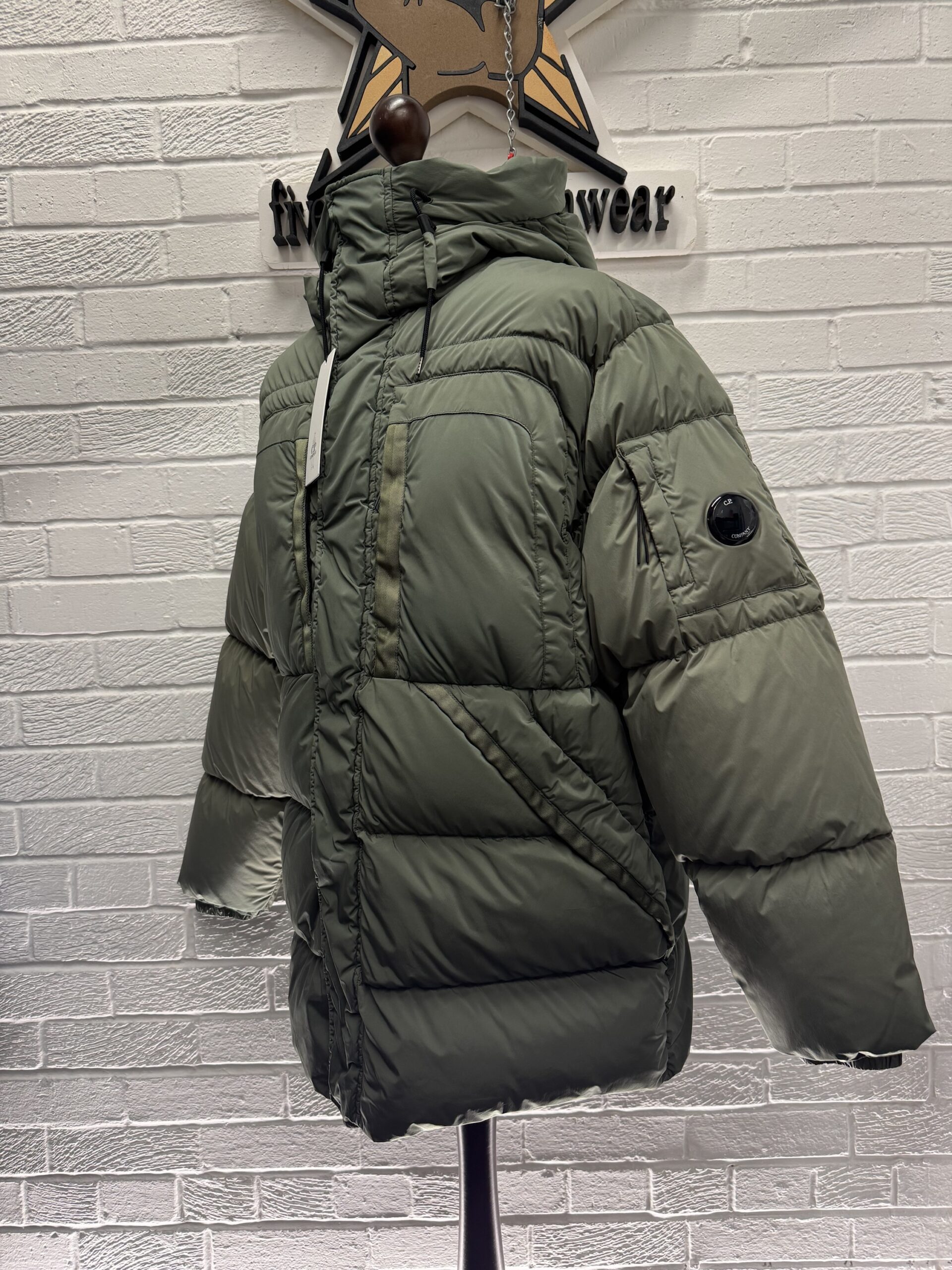 C.P. COMPANY GARMENT DYED ‘NYCRA-R”DOWN LENS HOODED JACKET IN GREEN Medium / p2p 24”