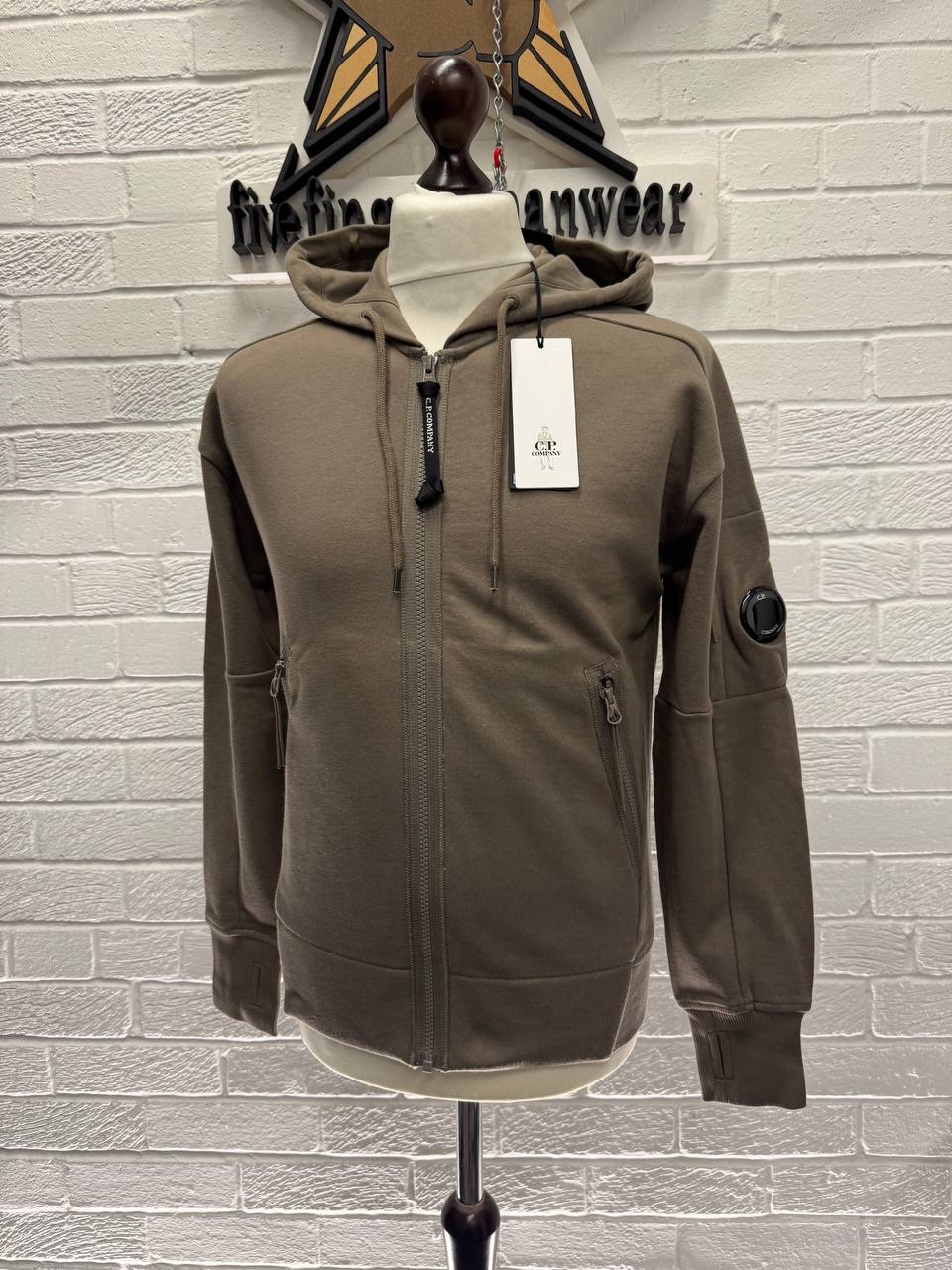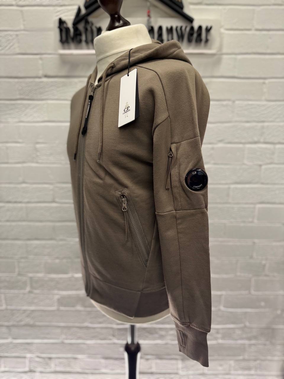 CP Company 025A Diagonal Raised Fleece Hood Open Zipped Sweatshirt in Walnut