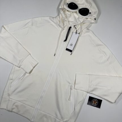 CP Company Diagonal Raised Fleece goggle Hood Open Zipped Sweatshirt- Gauze white