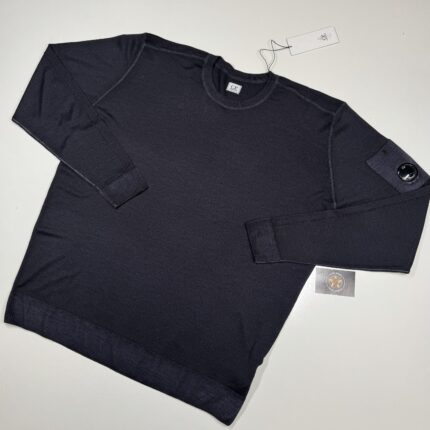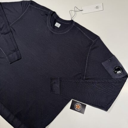 Classic crewneck jumper crafted in premium fast dyed merino wool for optimal warmth and comfort, featuring ribbed cuffs and hem and a C.P. Company Lens detail on the sleeve pocket.