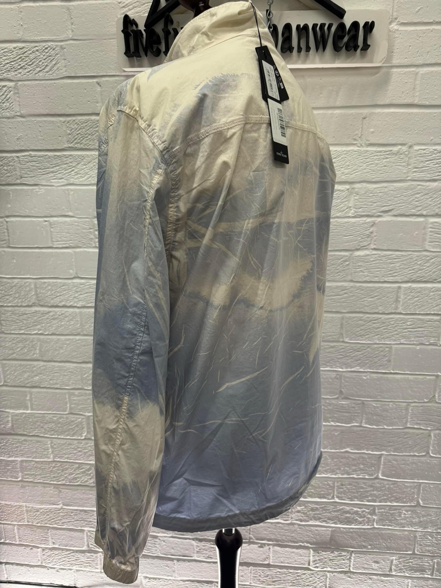 LIGHT REACTING ‘LUCE’ PRINT TECHNIQUE: Half zipper overshirt in stretch cotton ‘parachute’ canvas. The piece is printed using the Stone Island iconic ‘Luce’ technique. The garments are soaked in a special light sensitive bath in a dark room. They are then individually exposed to vivid light, with specially designed calotypes in between, so as to create ‘photographic’ patterns and designs on the garment surface. The special feature of this technique is the impalpable feel of the print. The pieces are then dried and over dyed.