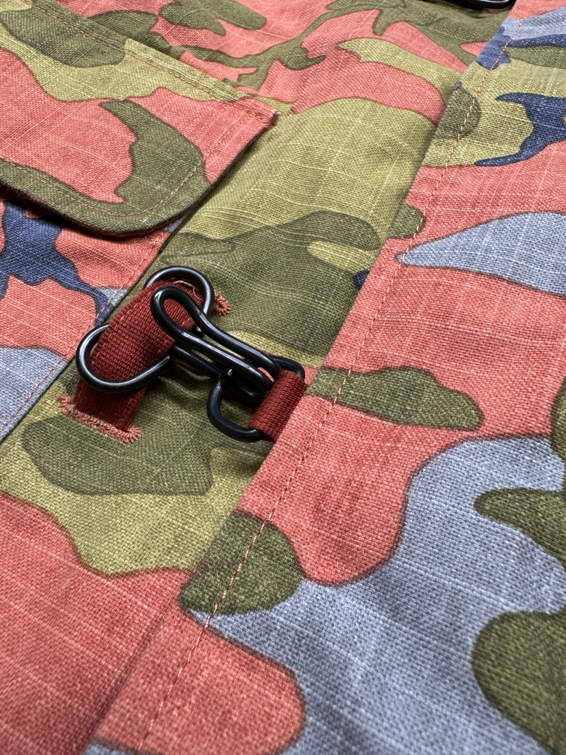 Field Jacket made in a nylon ripstop printed with the revisited archival printing pattern of the Ice Jacket Camouflage ‘090. All the shades present in the 3 color variants of the time are recombined to obtain 2 new versions with vertical or diagonal shading. The garment is made of a slightly slub weave ripstop both in the weft and warp, composed of mechanically spun nylon fibers. In the spinning process, the nylon filaments are steamed to create an appearance closer to organic fibers. Light internal resin coating. PFC-free anti-drop treatment.