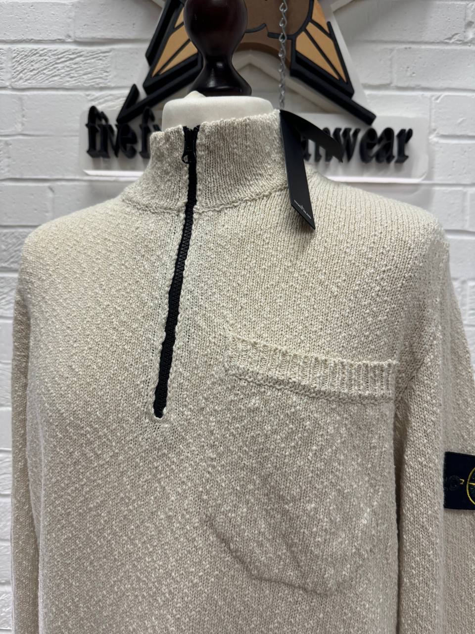 Dive in style with the Stone Island Half-Zip Sweater, item no. 563B1, in the timeless colour beige .Made from uneven cotton yarn for a subtle ‘knotted’ effect on the knitting surface, this sweater offers a unique blend of style and comfort. Features: Looser fit with stand-up collar and a half zipper. Chest pocket with ribbed entrance. Stone Island badge on the left sleeve. Rib knit cuffs and bottom hem. Composition: Made of 70% cotton and 30% flax/linen for a natural look and optimal wearing comfort.